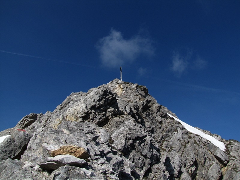 Vom Lachenjoch aus folgen wir nun immer dem Grat der geradewegs auf den Gipfel zuläuft. Anfangs noch ohne jegliche Schwierigkeit steigen wir hinan und treffen schon bald auf ausgesetztere Passagen. Nach und nach gestaltet sich der Anstieg schwieriger und wir müssen nun auch unsere Hände einsetzen, die jetzt fest zupacken müssen. Allerdings ist die Kletterei nicht allzu schwierig, setzt aber auf alle Fälle eine absolute Trittsicherheit und ein wenig Erfahrung im Fels voraus. Durch ein kleines Latschenfeld müssen wir noch hindurch dann noch ein wenig Kletterei und zum Schluss noch über eine steile Grasmatte hinauf zum Gipfel.