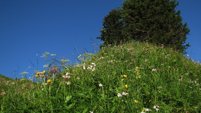 Ausgangspunkt für die Tour ist der gebührenpflichtige Parkplatz (6-18 Uhr, ab 2 Stunden 4 €, bei Benutzung der Bergbahn werden 3 € erstattet) der Wannenjochbahn in Schattwald. Am linken Ende des Platzes am Kneippbecken vorbei und über den Stuibenbach. Danach über den Fahrweg und gerade hinauf zum nächsten Forstweg. Diesem nach rechts folgen und nach der Brücke links in Richtung Stuibenalpe. Der Weg wird zunehmend schmäler und führt zuletzt zu den freien Flächen unterm Bschießer, die zur Stuibenalpe gehören. Nun zum Wegweiser, hier halbrechts dem schwachen Steig mit alten Markierungen folgen. Sobald er sich die Flanken hochschlängelt, wird der Weg deutlicher. Oben im Sattel zwischen Kühgundkopf und Bschießer gibt es zwei Möglichkeiten. Ich bin weglos an den Bäumen der Bschießerflanke entlanggequert, Richtung Westen. An der Kante ein Blick hinab auf das Gelände um die Zipfelsalpe und den Stuibenkopf. Dann hinabgequert um ohne weiteren Höhenverlust zum Nordostgrat zu kommen, der zum Nordrücken hochzieht. Alternativ und empfehlenswert kann man im Sattel auch dem Wanderweg zur Zipfelsalpe folgen und sobald der nach links ums Eck biegt auf den Älplerweg achten, der nach Süden ins Kar unterm Bschießer führt. Ihm folgen, bis man zum oben erwähnten Nordostgrat hinüberqueren kann. Zunächst den Grat hinauf, er ist teilweise recht steil, aber wenig ausgesetzt, gut gestuft und ausreichend breit. Oben auf dem breiteren und flacheren Nordrücken empor. Hier muss man etwas aufpassen, der alte Stacheldrahtzaun samt Pfosten liegt am Boden unter Gras. Man kann auf den glitschigen Pfosten super ausrutschen, da sie unter der sommerlichen Vegetation nicht zu erkennen sind. Vor dem Gipfelaufbau legt sich der Rücken beinahe flach zurück, hier hat man nun auch wieder zwei Varianten, wobei nur eine zu empfehlen ist. Ich bin direkt am Grat weiter durch die Latschen, großteils aber auch frei, dann aber brüchiger Gras-Stein-Untergrund. Besser ist es, wenn man nach links in die Flanke rausquert und dann ohne auf den Grat zurückzukehren dem Gipfel entgegensteigt. Hier ist es dann eine steilere Grasflanke, von oben sah es problemlos aus. Der Gipfel des Stuibenkopfs ist recht geräumig und mit einem Vermessungspunkt versehen. Wenn man von der Zipfelsalpe über die Nordwestflanke aufsteigt muss man auch über den flachen Rückenabschnitt zum Gipfel, der direkte Aufstieg zum Gipfel wird komplett durch Latschen verlegt.