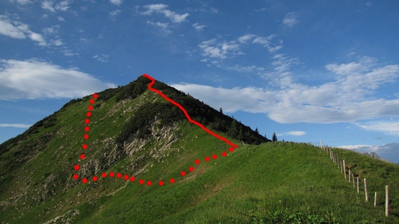 Vom Gipfel hinab zu der Wanne knapp unterhalb des Gipfels und durch die Lücke in den Latschen in die Ostflanke und durch eine weitere Lücke eine unangenehme Querung in der Grasflanke. Das Gelände ist nicht unbedingt steil, der Untergrund aber nicht so toll gangbar. Man zielt einfach auf den Verbindungsgrat zum Bschießer. Dieser ist größtenteils auf einer Pfadspur zu begehen, ob das nun reine Wildwechsel sind oder ein alter Jägersteig kann ich nicht sagen. Die Latschen sind immer wieder leicht ausgeholzt. Zumeist werden Aufschwünge links in der Flanke umgangen. Ein Aufschwung wird durch eine bröselige Rinne in rechten Seite umgangen, hier zeigt sich ein deutlicher Pfad Südabbrüchen, er führt direkt auf den Felskopf. Danach wieder am Grat weiter, allerdings wird der Pfad undeutlicher. Im weiteren Verlauf eine Grasrinne nach links oben queren, durch die Latschen zu einer größeren freien Fläche zwischen Latschen und Abbrüchen. Sobald man die Fläche erreicht nach links hinüber zu einer kleinen schrofigen Stelle queren und weiter in dieser Richtung durch die Latschen zu einer kleinen Lichtung und nochmals über die Latschen, weiterhin Richtung beibehalten. Danach einfach die Grasflanke nach oben und entweder auf den Gipfelgrat oder durch die Flanke querend zum Gipfel des Bschießers. Eventuell kann man von der freien Fläche am Grat auch über deren linkes, oberes Ende durch die Latschen queren. Bliebe auszutesten, ob das besser geht.