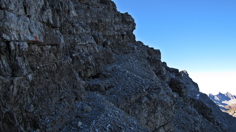 Zunächst geht es den Rücken auf Steigspuren und Felsgelände (I. Schwierigkeitsgrad) hinauf, wobei sie die Schwierigkeiten allmählich steigern. Wem das zuviel wird, der sollte hier noch einigermaßen glimpflich umdrehen. Am Ende des Rückens geht es nach rechts hinaus auf ein Band (I, roter Pfeil). Hier ist die eigentlich einzige (vermutlich dauerhaft) feuchte Stelle des Aufstiegs. Besonders im Herbst wird es hier gern vereist sein, nicht so gestern. Eine Umgehung der Stelle ist je nach Ausmaß des Vereisung möglich, sowohl etwas schwerer direkt von unten, als auch obenrüber.