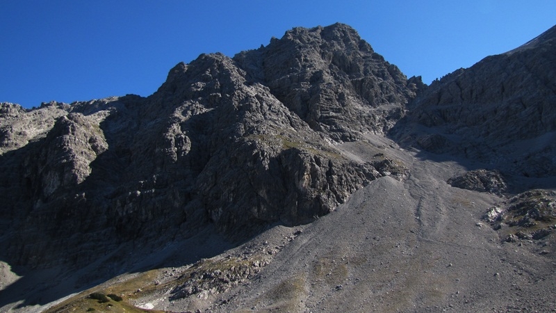 Ab der Hütte gibt es zwei Möglichkeiten weiterzusteigen. Nach rechts, dem Weg zur Bretterspitze folgend oder links auf dem Weg hinter die Hütte zum Hubschrauberlandeplatz und recht direkt über Schutt aufwärts, teilweise sind hier Steigspuren vorhanden. Dieser Weg führt dann hinauf zur Querung vom Bretterspitz-Weg, ist als Aufstieg sicher mühsam und deshalb nur, aber dann unbedingt (schnelles Abfahren über Geröll), für den Abstieg zu empfehlen.