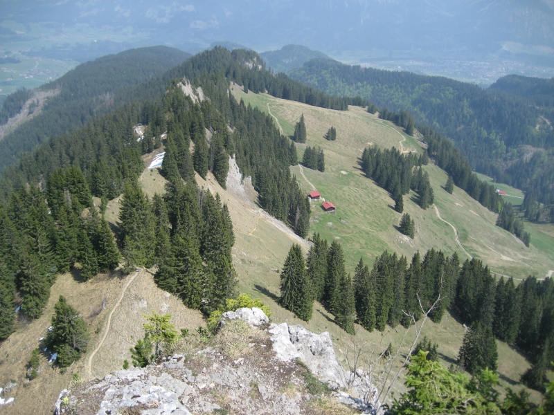 Nach der umfassenden Gipfelschau (leider war es aber zu trübe um ansehnliche Fotos zu schießen) zu den eindrucksvollen Gipfelreihen der Allgäuer Alpen, geht es wieder über den Klettersteig und den Grat hinunter zur Oberen Gundalpe (1550m). Von dort erfolgt der Abstieg über weite Weideflächen hinunter ins Gutswieser Tal, vorbei an zahlreichen Almgebäuden und zuletzt über einen recht langen Wegabschnitt über Asphalt hinaus nach Tiefenbach. Von dort nochmals zehn Minuten einem Radweg folgend zurück zum Parkplatz am Hirschsprung. Der Name dieser eigentlich prähistorischen Trockentalenge, durch welche ursprünglich die Breitach floss, leitet sich von einer Sage ab, der zufolge ein Hirsch bei seiner Flucht vor einem Luchs über dieses Felsentor gesprungen sein soll.