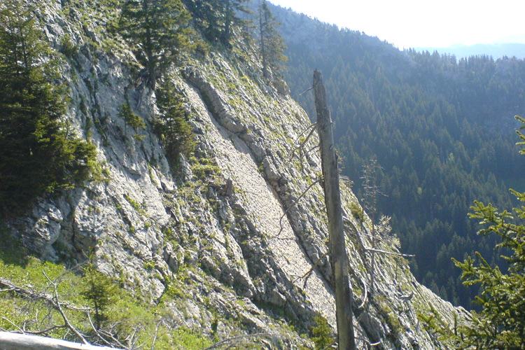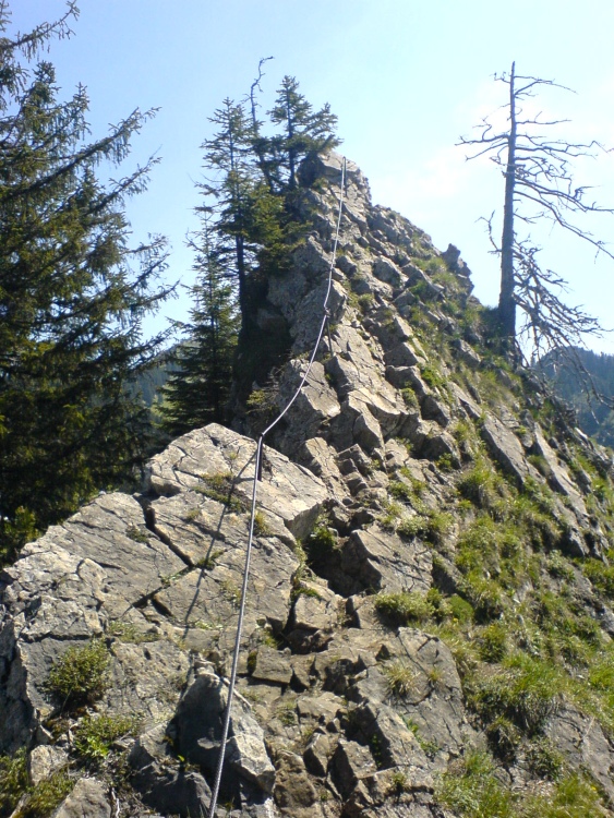 Der Übergang vom Gipfel des Burgberger Hörnles zum Verbindungssattel des Grünten ist dann das schönste und spannendste Stück der ganzen Tour. Über einen schmalen Grat, welcher aber seilgesichert ist, geht es hinüber zu der Einsattelung. Tiefblicke auf beiden seiten machen es interessant, nur leider ist diese Passage recht kurz. Über den Wiesensattel geht es in Richtung