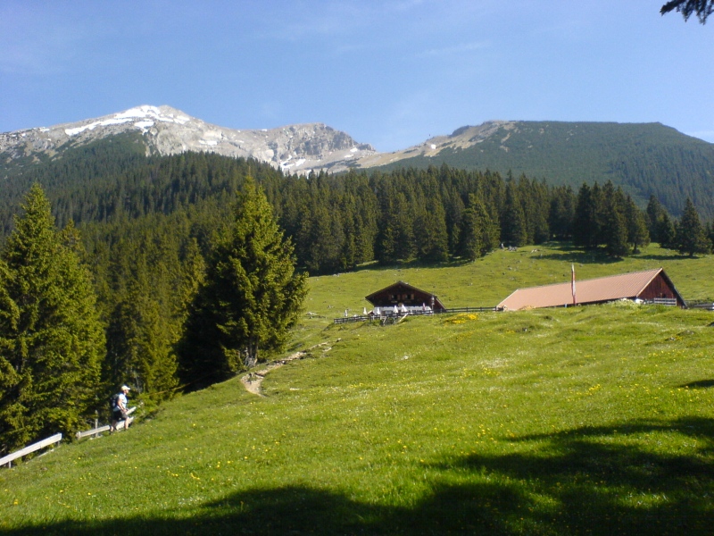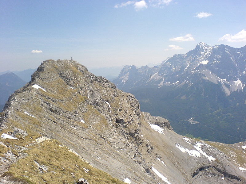 Weiter durch eine langgezogene Einsattelung am Grat entlang hinunter und im Osten wieder ansteigend zum Gipfel des Daniels (2340m), dem höchsten Gipfel der südlichen Ammergauer Alpen. Nach der aussichtsreichen Gipfelrast wieder über die Einsattelung hinüber in Richtung Upsspitze und dort wo der Grat wieder aufschwingt, nach links über Geröllfelder auf die nach Süden ausgerichtete, mit Latschen und weiter unten mit Fichten bestandene Geländekante. Auf etwa 1600 Metern Höhe über einen schönen Weidegrund und im weiteren Verlauf zurück zu der Tuftlalm. Von dort über den Aufstiegsweg zurück und hinunter zum Panorama-Bad bei Lermoos.