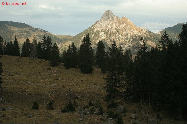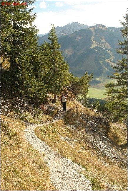 Rasch gelangt man an eine Schotterrinne, ab dieser dann nicht mehr weiter absteigen, sondern waagrecht die Höhe beibehalten um die Latschengasse zu treffen. Durch die Gasse dann in eine bewaldete Einsattelung und jenseits der Geländekante in die unten anschließende Weidefläche hinunter. Hier trifft man nun auch wieder auf den von der Einsteinhütte heraufleitenden Steig. Diesem folge ich bis hinunter zur Hütte und weiter durch einen Mischwald, bis dieser auf den aus der Enge heraufleitenden Forstweg trifft. Auf diesem zunächst hinab und die nächste Abkürzung über einen Steig nützend hinunter zum Parkplatz an der alten Grenzstation.