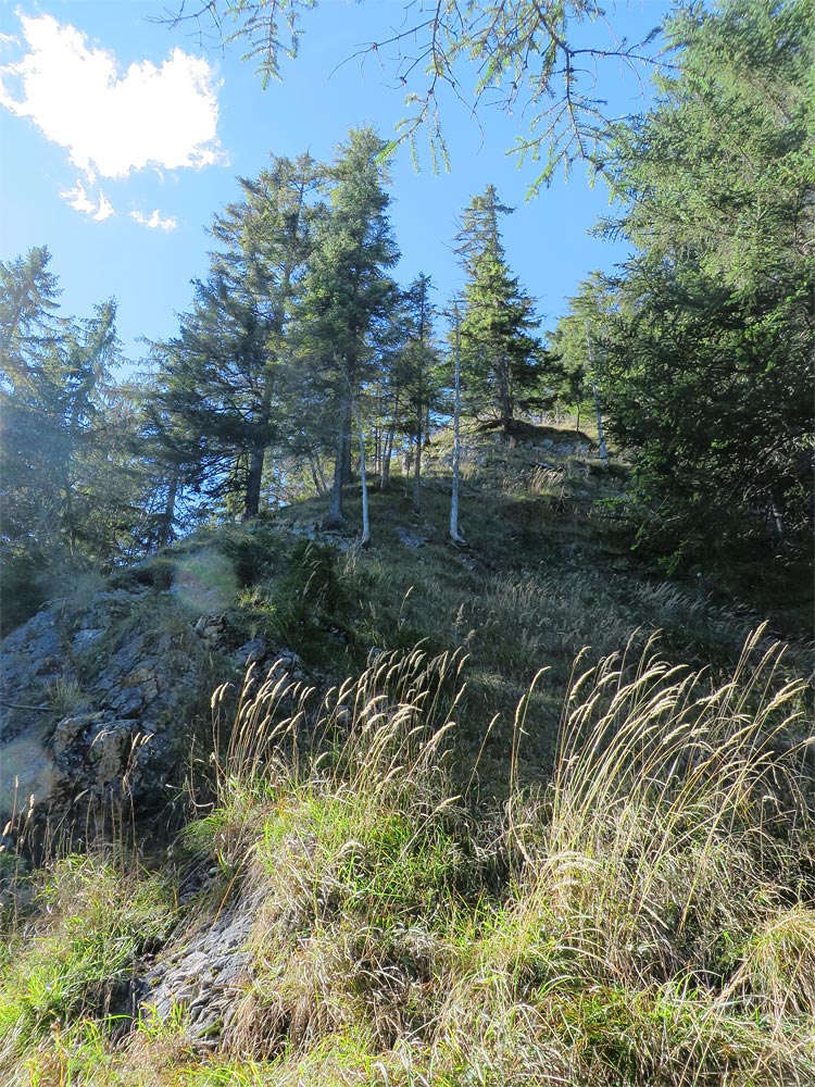 An der Kante zum Sattel hin führen einige steilere Grasrinnen hinab. Halt geben zusätzlich die zahlreichen Latschen und die Schrofentritte. Schnell ist man über die Passage hinabgeklettert (I-) und erreicht den Sattel, von welchem recht versteckt gegen Süden ein kleiner Pfad in einer Schleife durch einen Wiesenlatz hinab zieht. Aber zunächst geht es weiter gen Westen, durch Schrofen und mit kleinen Bäumen bestandenen Wiesenhängen hinauf zum sich weiter oben wieder zuschnürenden Grat, in manchen Quellen als