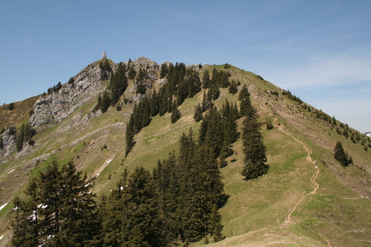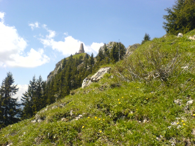 Grüntenhaus" hier anlangen, treten wir aus dem Waldstreifen heraus und über uns ist schon die Sendeanlage am Vorgipfel zu sehen. Wenige Minuten später ist dieser Vorgipfel auch schon erreicht. Links an dem großen Gebäude unterhalb des Seilbahnvorbaues vorbei und über den Gipfelrücken zum Hauptgipfel mit Jägerdenkmal.