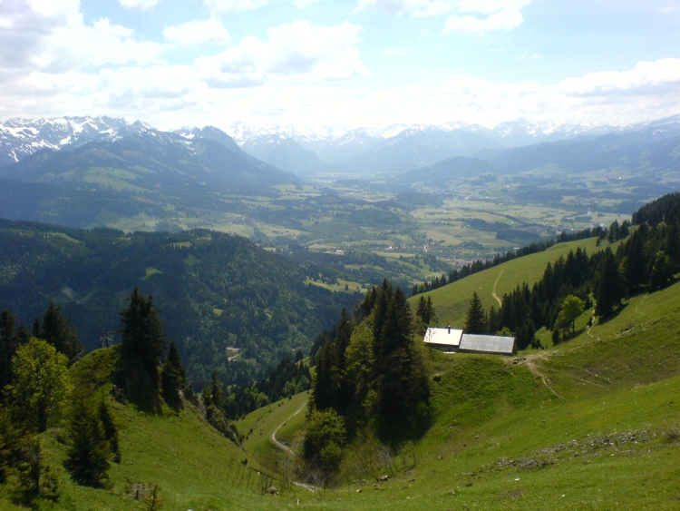 Nach einem herrlichen Rundumblick in alle Himmelsrichtungen und ausgiebigem Knipsen, geht es am Nordostgrat über den Steig hinunter bis zu einer Abzweigung. Dort rechts haltend hinab in einen kleinen Sattel und abermals nach rechts und unterhalb der Schrofen des Grüntens einen breiten Steilhang querend. Bei Nässe ist der Steig sehr schmierig und die Schneereste der letzten Woche füllen noch ein paar kleine Tobel, was die Sache nicht weniger rutschig macht. Bei der Zweifelgehrenalpe, die auf einem kleinen Felsabsatz thront, ist der Weg aber dann wieder recht passabel und so geht es geschwind hinunter zu der "Oberen Alpe Schwand". Wir steigen weiter über das Weidegebiet ab und nach etwa einer halben Stunde treffen wir auf das kleine asphaltierte Sträßchen, an welchem wir weiter talauswärts unser Gefährt geparkt haben.