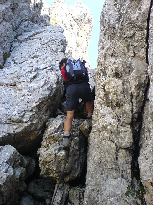 Von der Scharte aus verfolgt man nun einen kleinen Weg, welcher bei Nässe und noch frühmorgens wenn noch der Tau auf den Matten liegt sehr rutschig sein kann. Über ein paar Kehren empor folgt auch schon wieder ein Abstieg durch eine Felsrinne (I+). Unten angelangt quert man über schotteriges Terrain und bald über eine brüchige Rippe (I) wieder nach rechts hinauf. Wieder ein kleiner Quergang der vorsichtig genommen wird und dann folgt der Einstieg in die Gipfelrinne. In leichter Kletterei (I) einige Minuten dem Kamin entlang, gelangt man zu der Schlüsselstelle (II) der Tour, welche allerdings durch ein Stahlseil entschärft ist. Über einen eingekeilten Klemmblock senkrecht hinauf, wobei auch Eisenstifte die Sache zusätzlich erleichtern.
