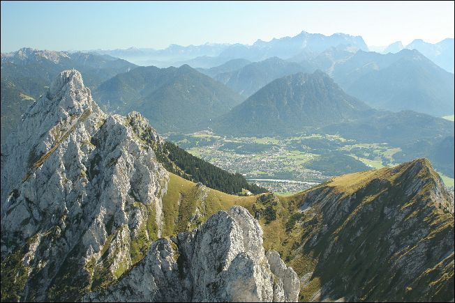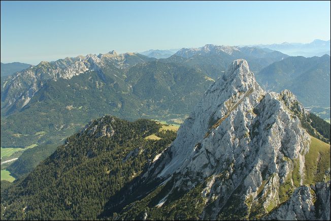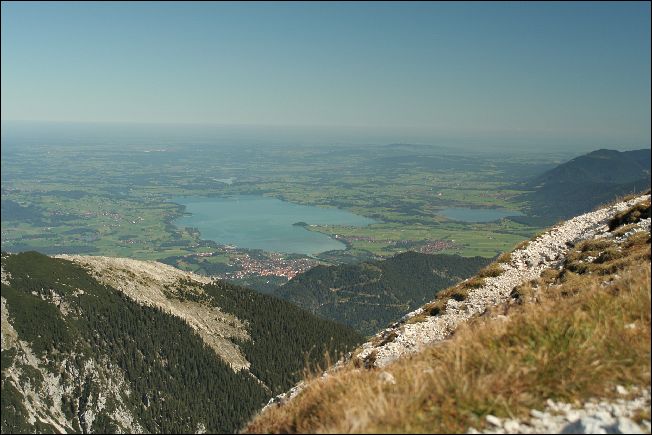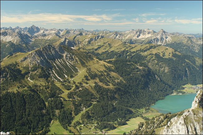 Nach diesem Part wieder durch den oberen Teil des Kamines (I) weiter, bis man in den kleinen Sattel trifft. Sogleich sieht man durch die Felskluft auf das Füssener Land hinaus und kann sich so schon einen Vorgeschmack auf die am Gipfel gebotene Aussicht holen. Nach rechts über gut griffigen Fels hinauf (I) und in wenigen Minuten zum Gipfel. Bei einer guten Brotzeit kann man jetzt das "Super-Panorama" auf sich wirken lassen. Da ich ja für heute noch was vor hatte, musste ich leider auf einen Abstecher zur Gehrenspitze verzichten, obwohl das Wetter wie geschaffen für eine solche unternehmung gewesen wäre. So bin ich halt den selben Weg, den ich heraufgekommen war auch wieder hinunter.