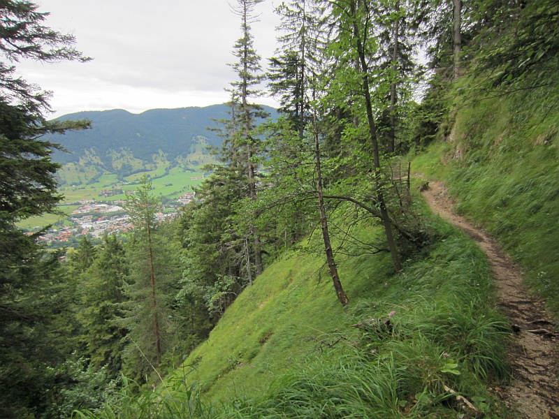 Die Aussicht ist herausragend, obwohl man lediglich 500 Höhenmeter für diesen Gipfel absolvieren musste. Wir steigen wieder ab in den Kofelsattel und folgen gegen Westen dem Königsteig, der anfangs etwas langweilig daherkommt. Mit zurückgelegter Strecke wird dieser aber interessanter und idyllischer, bis er sich schließlich an der zweiten Regenunterstandshütte verzweigt. Wir folgen dem Wegstück zum Kolbensattel.