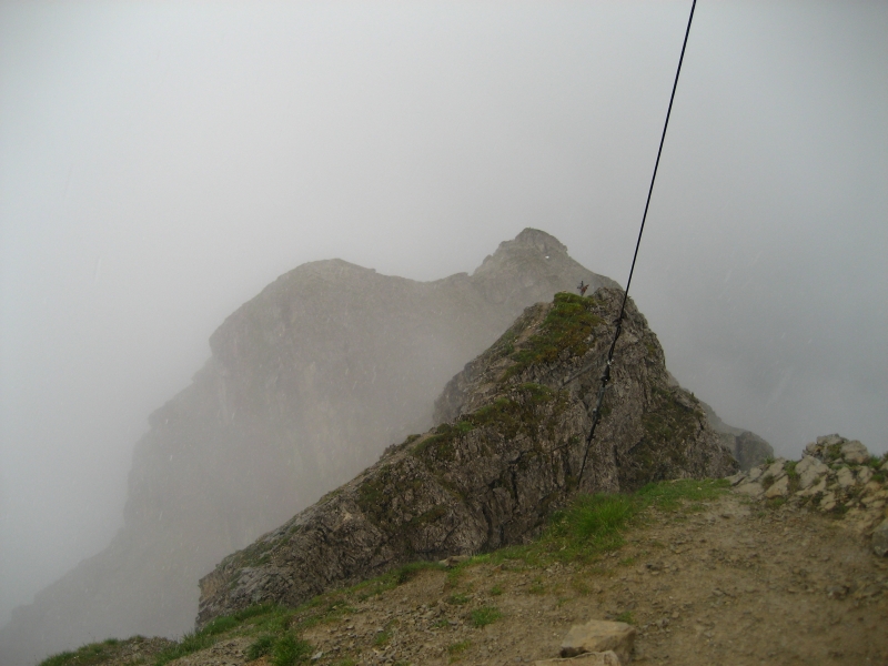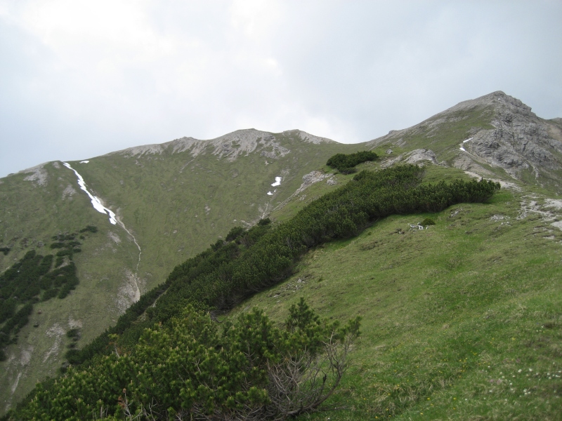 Mir ist es leider nicht vergönnt, mich sonderlich lange am Kreuz aufzuhalten, denn schon seit der kettengesicherten Stufe schüttet es wie aus Eimern und als ich das Gipfelkreuz passiere kracht auch schon Donnerhall über meinen Kopf hinweg. Im Laufschritt haste ich den Gipfelgrat und die ersten Schrofenstufen hinunter. Ich überhole ein paar Leute, die auch nicht erfreut zu sein scheinen, über die momentane Akustik. Bald bin ich aber am Gratrücken des Schwarzenköpfels angelangt und das Donnern hat sich etwas entfernt. Durch die Latschengassen geht es an dem Abbruch zum Hochgrießkar hin entlang nach Westen.