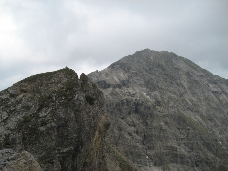 Von nun an wieder emporsteigend, geht es Unschwierig über den Gratverlauf und an einigen Schrofenköpfen vorbei. Der Grat verschmälert sich zusehends und kurz vor dem Gipfel verengt er sich zu einem schmalen Balken, welcher zu einer etwa mannshohen Stufe (II) leitet. Die Stufe ist allerdings mit einer Kette gesichert und man kann sich unter geringem Kraftaufwand daran hoch hangeln. Gleich danach trifft man auf eine abgeschrägte Platte, welche ein kleines schmiedeisernes Kreuz trägt. Über diese Platte hinweg und am weiterhin sehr luftigen Grat hinüber zum großen Gipfelkreuz der Kreuzspitze.