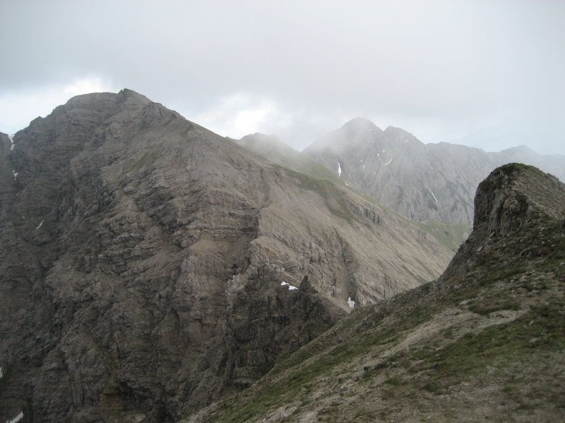 Nach einer Rast steige ich auch noch in die nördlich gelegene Scharte zwischen dem Kreuzspitzl und der Kreuzspitze ab, um zu sehen wie der Weiterweg aussehen würde. Die Wolken hängen jetzt schon dicht über der Kreuzspitze und die ersten Nebelschwaden streichen über den Kamm. Über den geröllreichen Kamm nach unten in die Scharte, führt der weitere Abstieg nun unmittelbar hinter einer Felsnase über eine kleine, gutgriffige und gestufte Wand (II) nach unten.