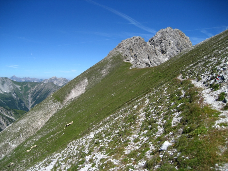 Loregghütte. Oberhalb des Almgebäudes an vielen Schafen vorbei und in einer Schleife unterhalb der Loreakopfflanke zum Kragenjoch (2008m) hinauf. Dem Wegweiser nach links zur Scharte folgend, geht es über einige Kehren und einer steilen Flanke in die Loreascharte (2375m) empor.