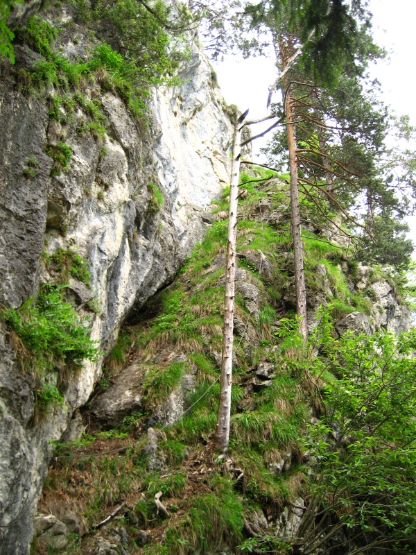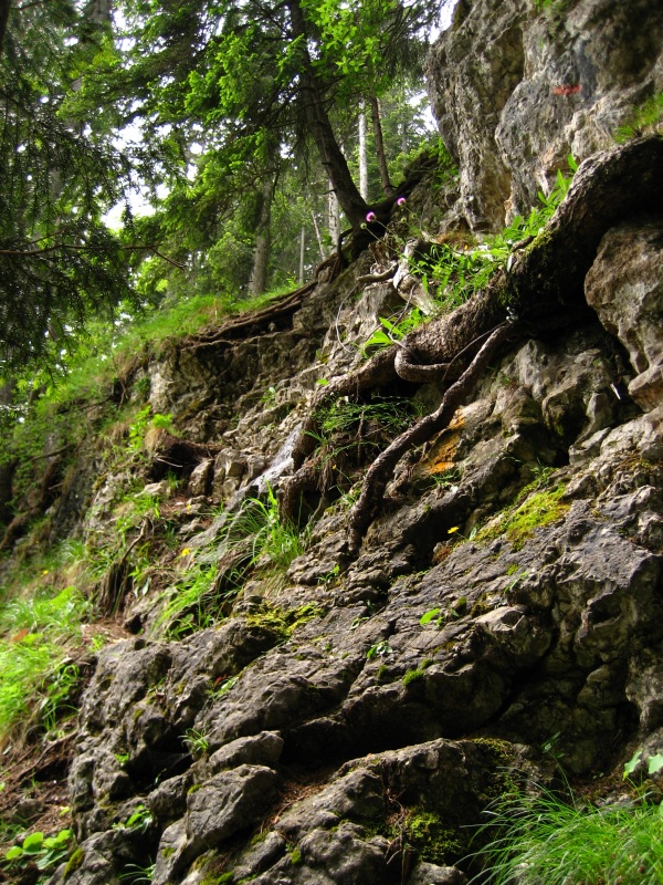 Man tut gut daran, dieser „Sicherung“ nicht allzu viel Vertrauen entgegen zu bringen und sich lieber an den vorhanden Wurzeln, welche einem wie Haltegriffe entgegenprangen, festzuhalten und über das Schrofenband empor zu ziehen. Ist dies absolviert, geht es daran eine äußerst steile Grasflanke leicht ansteigend und etwas ausgesetzt zu queren um im weiteren Verlauf zur nächsten und längeren seilgesicherten Passage zu gelangen.