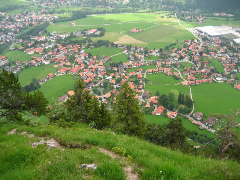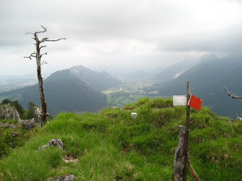 Von dort geht es erst einmal vom Ortsteil Pfronten-Steinach hinauf zu dem kleinen Gasthaus, dem Milchhäusl. An diesem linkerhand vorbei zu einer Wegverzweigung, an welcher wir dem rechten Steig folgen. In kurzen Kehren steigt dieser nun stark an und überwindet eine sehr steile Waldflanke. Hin und wieder kann man an Bäumen oder Steinen am Wegesrand rote Markierungen sehen und bald erreicht man eine kurze Schrofenpassage, welche mit einem wenig vertrauenserweckenden Stahlseil „gesichert“ ist.