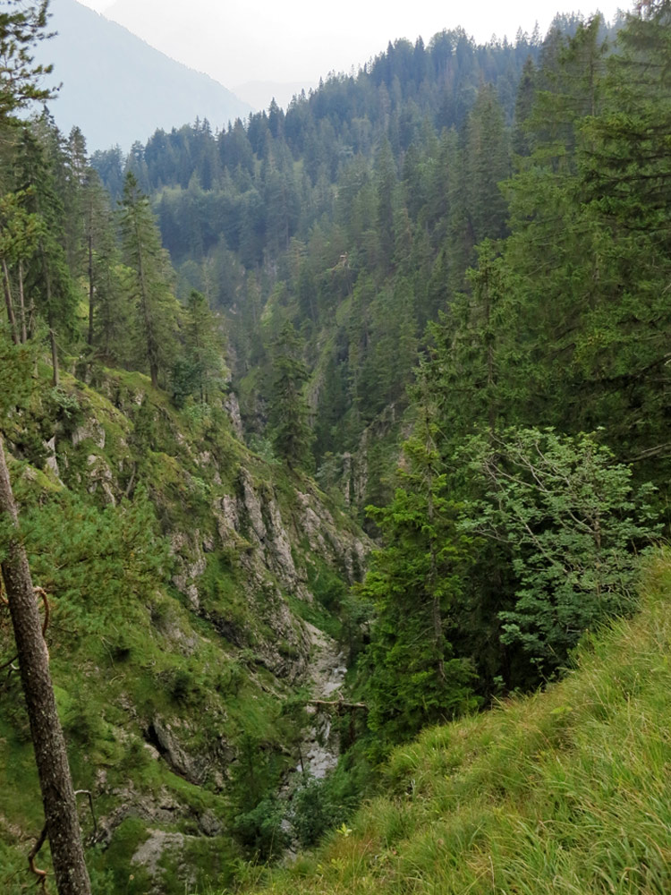 Tobels des Gehrebaches. Ein kurzer Stichweg führt an der den Tobel nördlich begrenzenden Flanke in das Innere des Tobels und geht bald in einen teils schon verwachsenen Steig über. Unterhalb des Pfades zeigt ein Zaun die Grenze des Weidegebietes an und soll die Tiere vor dem Absturz in die Schlucht bewahren.