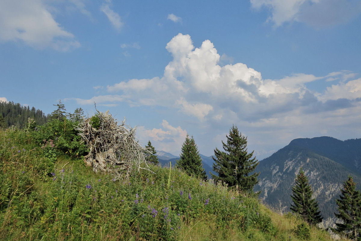 Dürrenbergs (1797m) aufschwingt. In selbstgewählter Steigung im Zick-Zack zu einem kleinen zerzausten und damit auffälligen dürren Bäumchen, das den weiteren Gratübergang in Richtung Sattel zwischen Dürrenberg und Koflerjoch markiert.