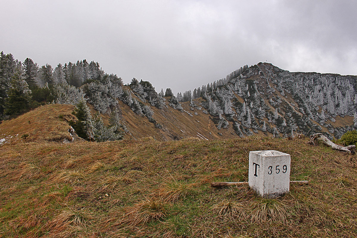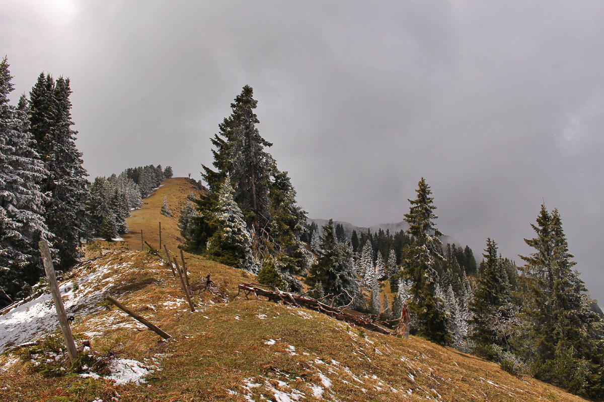 Saueregg gestanden hat. Heute wird die Weide zum Teil gemäht, wohl von Jägern wie es scheint und auf die auch ein Hochsitz und die Salz-Lecksteine an den Bäumen hindeuten. Weiter dem Rücken folgend erreicht man in Kürze den