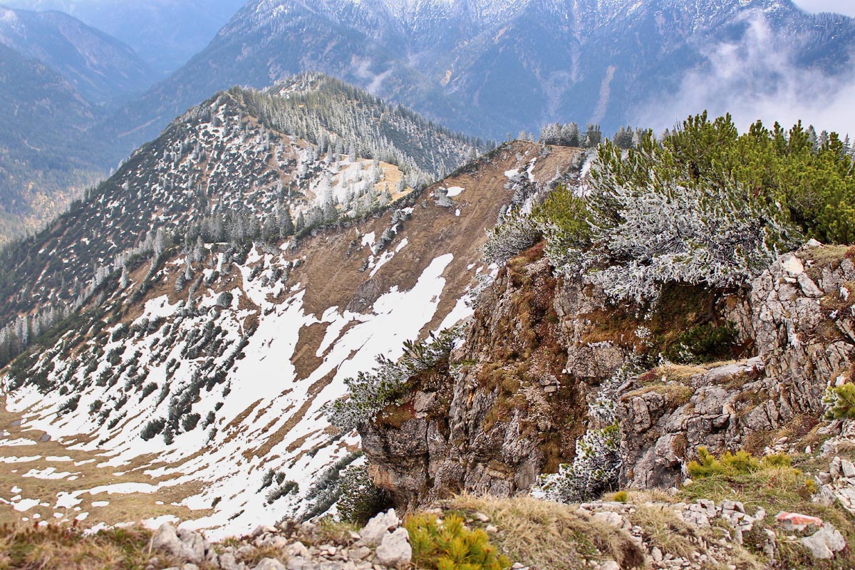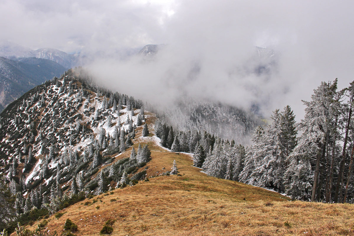 Ein Durchkommen durch das dichte Gehölz von verkrüppelten kleinen Fichten an der Gratkante erfordert hier etwas an Sucherei, ist aber schnell gemeistert und man trifft auf den ausgetretenen