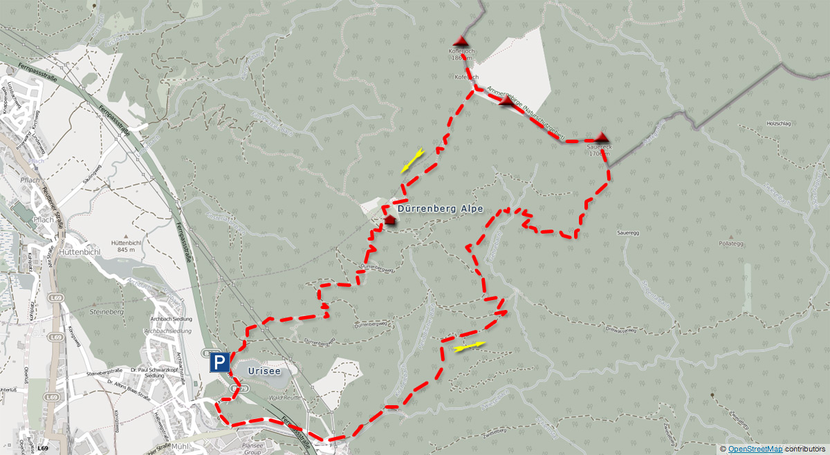 Dürrenberg Alpe. Ab dieser auf ausgeprägtem Weg direkt hinunter zurück zum Ausgangspunkt der Tour, dem