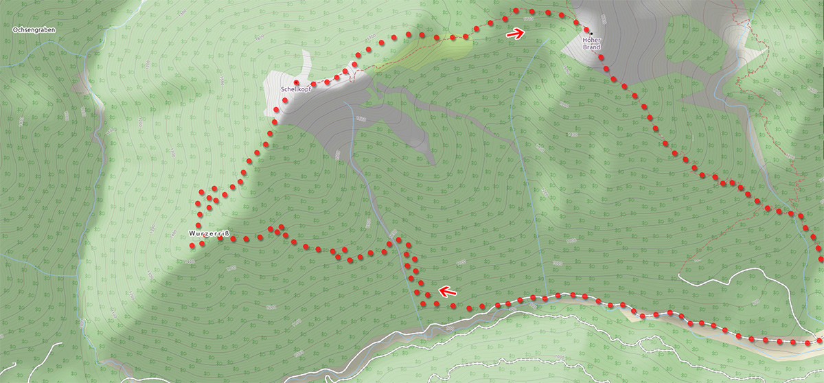 Griesen (Parkplatz) - Tal der Neidernach - Abzweig (900 M.ü.N.N.) - Stiereckgraben - Wurzerriß - Südwestgrat Schellkopf - Schellkopf - Am Trog - Hoher Brand - Schellalpe - Klamm - Griesen (Parkplatz)