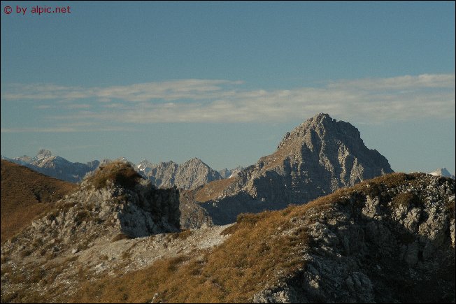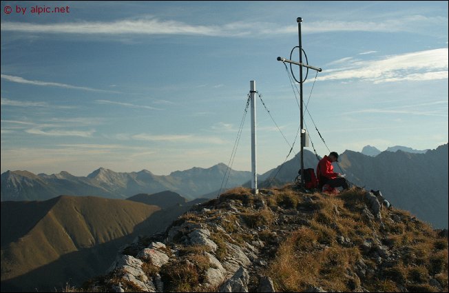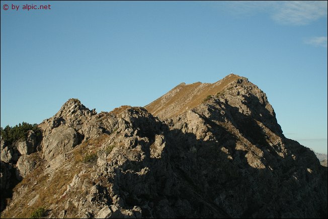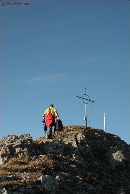 Kurz über eine kleine Steilstufe und man gelangt in den Gratbereich der Schlierewand-Nordostschulter. Immer am Grat bleibend über ein paar Schrofen hinüber zum Gipfelkreuz (2217m). Nach einer Brotzeit und einer ausgiebigen Gipfelschau geht es weiter über den Grat hinüber zum