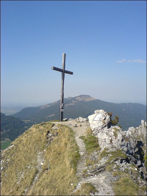 Danach in eine Einschartung und rüber auf die Westseite des Berges. Weiter über einen kleinen, teilweise schmierigen Steig geht es dann quer unterhalb von Felstürmen in stetigem auf und ab und häufigen kurzen (leichten) Kletterpassagen unter den Gipfelstock des Sorgschrofen hinüber. Über einen kleinen, seilgesicherten Steig den sehr steilen Graslatz zum Gipfelkreuz