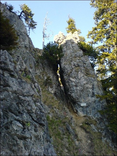 Zinken wieder hinab über die kleine, drahtseilgesicherte Steiganlage und durch das Felsenfenster. Ab der Weggabelung dann kurz absteigen und durch ein weiteres Felsenfenster in nordöstliche Richtung. Wer nicht durch das Felsenfenster passt ;), kann dieses rechts unterhalb des Schrofens umgehen.