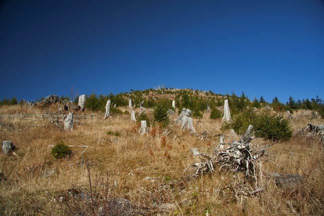 Da ich heute wieder einmal die Wanderkarte vergessen habe, weiß ich natürlich nicht, welchen Weg ich einschlagen muss und so steigen wir einfach weglos, steil über den baumstumpfbestückten Hang an.