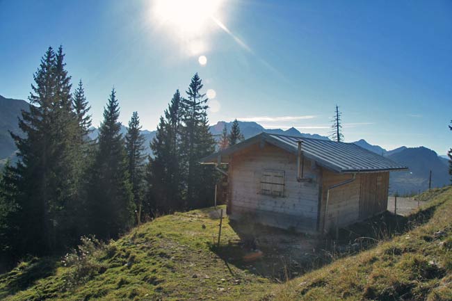 Der Steilaufstieg ist eine ziemlich heftige Plackerei und ich bin froh, dass wir nach etwa einer halben Stunde auf einen kleinen Fahrweg treffen. Der Fahrweg führt direkt zu einem kleinen Alpgebäude, das natürlich schon für den Winter dicht gemacht worden ist. An der kleinen Hütte vorbei über die Almweide, gelangt man nach wenigen Minuten auf den Steig. Nach ca. 10 Minuten hat man dann auch schon den Jochschrofen (Ornach) erreicht, der eine wunderbare Aussicht bietet.