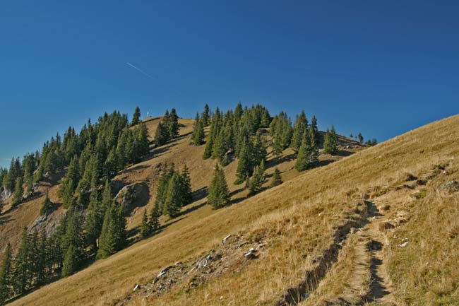 Nach kurzer Rast folgt ein kurzer Abstieg in nördlicher Richtung, in den Kessel hinter dem Jochschrofen. Von dort wieder aufwärts zum Steinpasssattel und zum Gipfelrücken des Spiesers (1.651m). Nachdem ich meine obligatorische Fotosession erledigt habe, geht es in Richtung Hirschalpe anfangs durch den Wald hinunter. Später führt der Pfad über Almweiden und durch ein kleines Tal hinaus zu einem Wegkreuz an einem Geländerücken direkt über der Hirschalpe.
