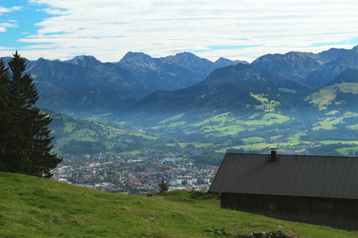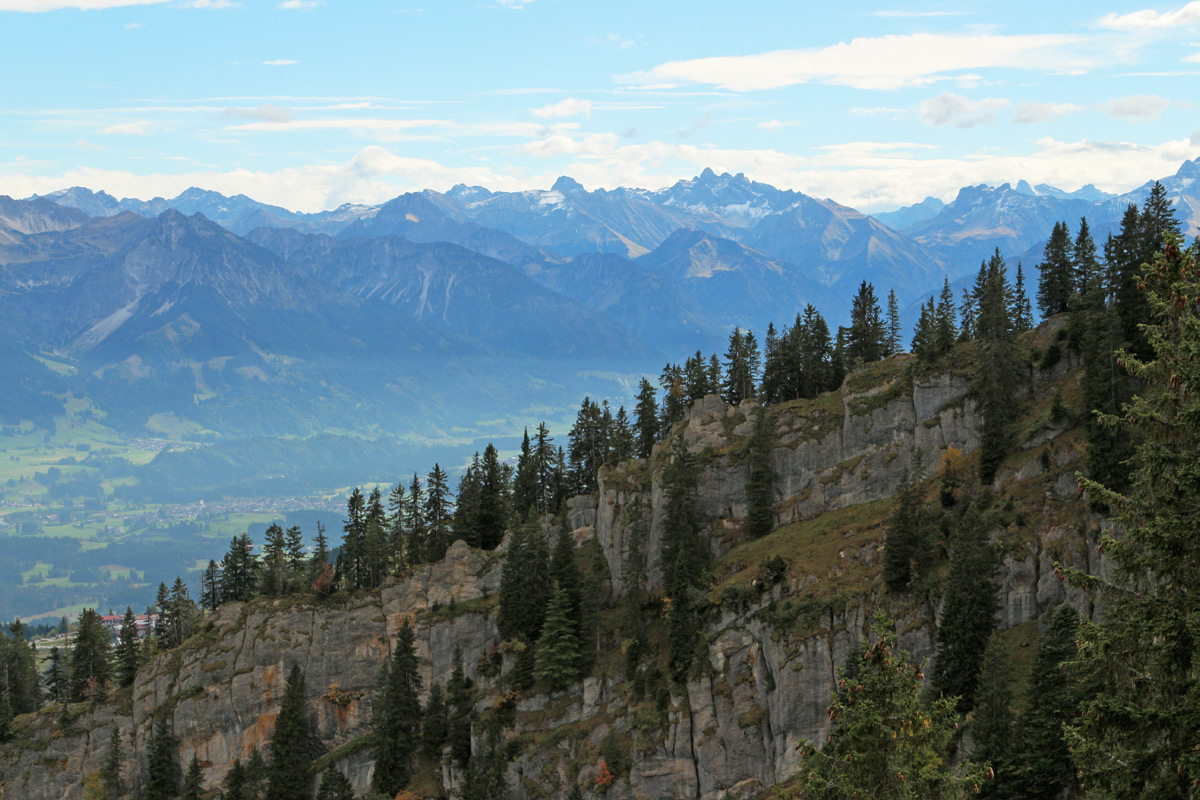 Die vorgeschobene Lage bietet ein herrliches Panorama und auch das heutige Wetter lässt recht passable Ausblicke zu. So kann man vom oberen Ende der Leiter schön durch das Steigbachtal hinaus nach Immenstadt blicken, oder im Osten auf die "Alpenstadt" Sonthofen schauen. Im Süden ragen die Gipfelreihen des Allgäuer Hauptkammes gen Himmel und im Südwesten gilt es die Berggestalten des Bregenzerwaldes und der nahen Schweiz zu betrachten.