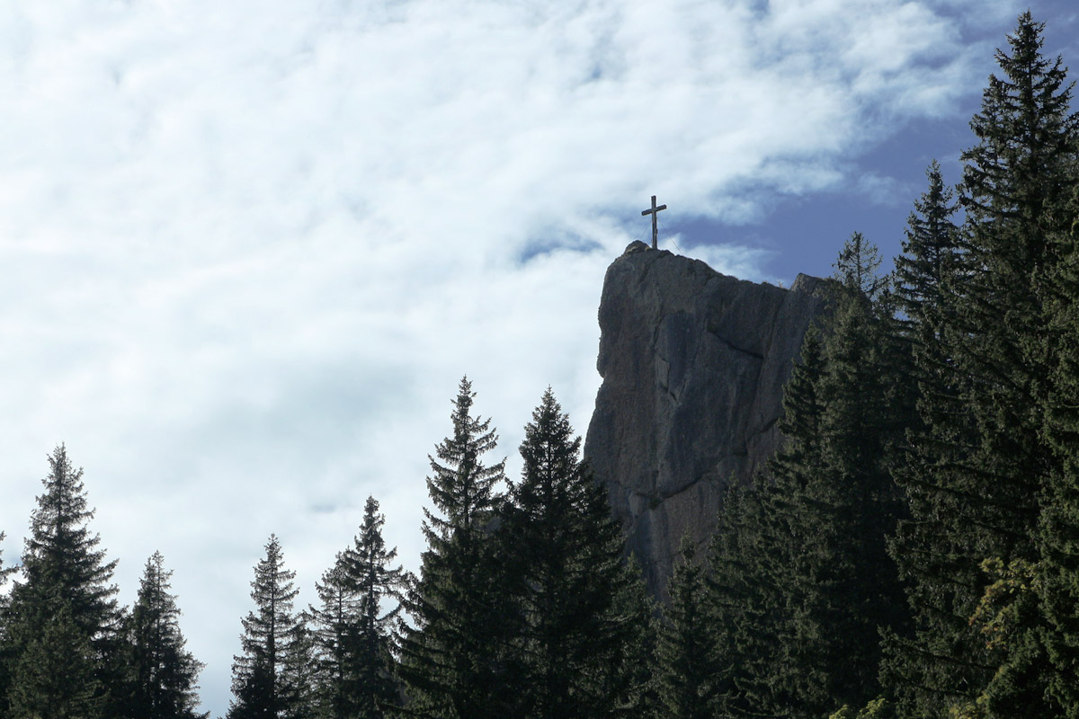 Unterkirchealpe erreicht. Wieso Unterkirchealpe? Ein kecker Nagelfluh-Felszahn ragt weit oberhalb des Alpgebäudes aus dem Wald, welcher trotz seiner schroffen Erscheinung mit einem imposanten Kreuz ausgestattet ist. Man könnte denken, eine