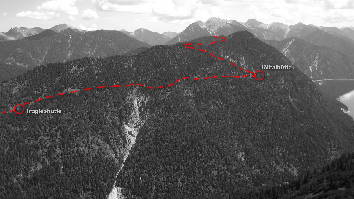 Wer die Runde ab hier schließen will, folgt dem Steig entlang der Hölltalkante hinab, wo er noch gut sichtbar ist. Erst im unteren Drittel oberhalb der Planseestraße ist der Wildwuchs wieder stärker und die flache Passage gegen Westen hinab zum Hotel Seespitze nicht immer eindeutig zu erkennen. Ab und an muss man etwas suchen, sollte aber gerade von oben kommend durchaus in der Lage sein, den Pfad doch zu erkennen. Der Rückweg kann dann entweder direkt an der Straße erfolgen oder man geht über die