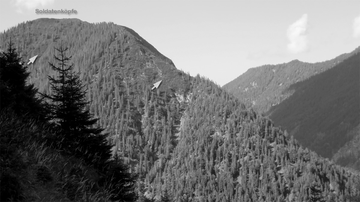 Von den wenig imposanten, dafür aber ammergauertypisch urigen Soldatenköpfen wieder hinab zum vorgenannten Steig, durch lichte Wälder und bald flacher werdende Böden bis zu einer Markierung, welche den Weg durch die Nordflanke des Widderegg´s hinab zum Fahrweg (Altenbergweg) anzeigt. Zuvor kann man aber noch über eine weitläufige und scheinbar von den Jägern gemähte Lichtung im Linksbogen zu der