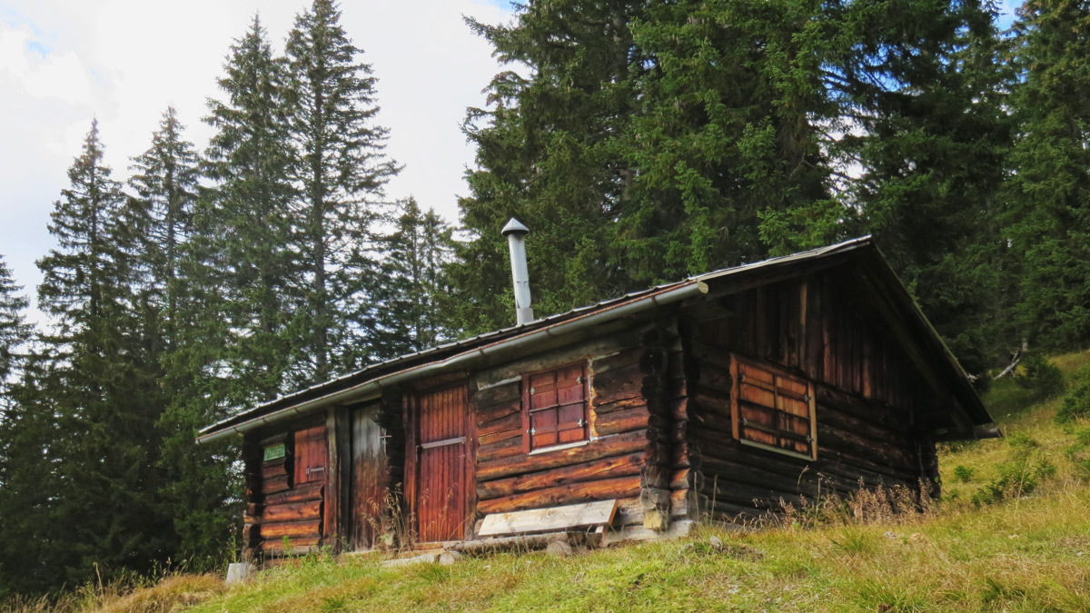 Von der Hütte den Hang hinaufschauend, geht es ein paar Meter nach links in Richtung eines