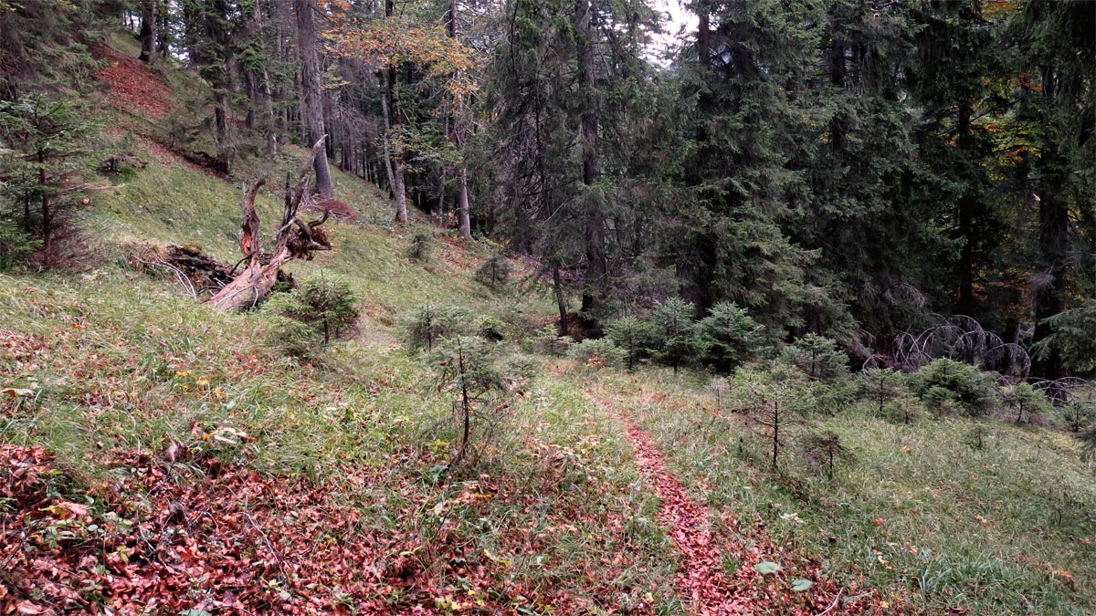 kleine, sumpfige Fläche aufweitet führt ein, je nach aktuellem Bewuchs, kaum sichtbarer Pfad rechterhand die Böschung quer hinauf. Noch etwa für weitere 50 Meter Gehstrecke den Hang querend, steigt man durch eine Waldschneise direkt bergan. Das Gelände steilt schnell auf, jedoch wird im oberen Bereich der Weg besser sichtbar. Alte Stahlseile (vermutlich von einer Holzbringungsaktion übrig geblieben) liegen zwischen den Bäumen und über einen etwas bröseligen Absatz auf eine etwas ebenere Geländestufe. Hier heißt es aufpassen, weil in diesem Bereich der Weg nach Osten schwenkt und recht flach durch ein paar gutmütige Tobel zu der Lichtung mit der
