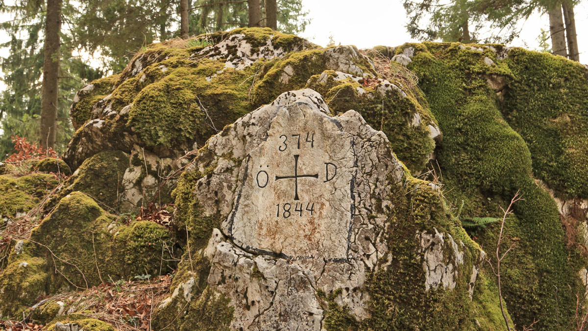 die Grenzmarkierung auf einer Felsplatte in der Nähe des Alpseeblickes