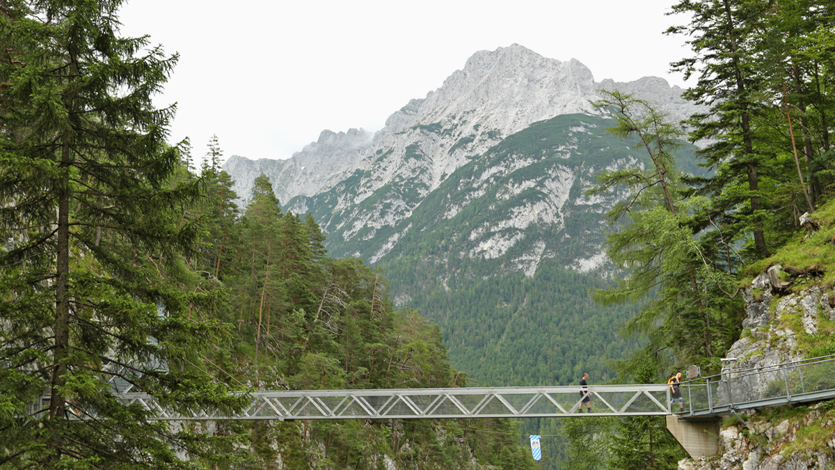 die Panoramabrücke in der Leutascher Geisterklamm öffnet den Blick gegen Osten hin zum Karwendel