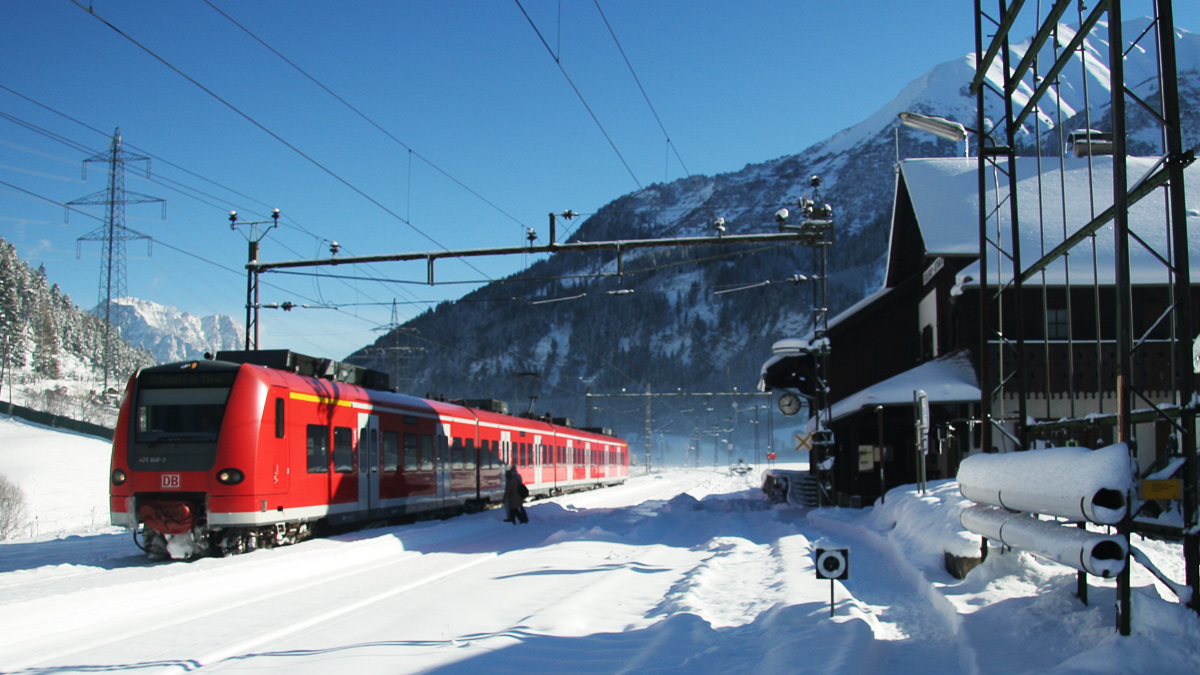 eine Garnitur der DB an der Strecke Außerfernbahn am Bahnhof Bichlbach-Berwang - die Aufnahme von 2005 zeigt das denkmalgeschützte Bahnhofsgebäude, welches am 7. März 2014 leider einem Brand zum Opfer gefallen ist