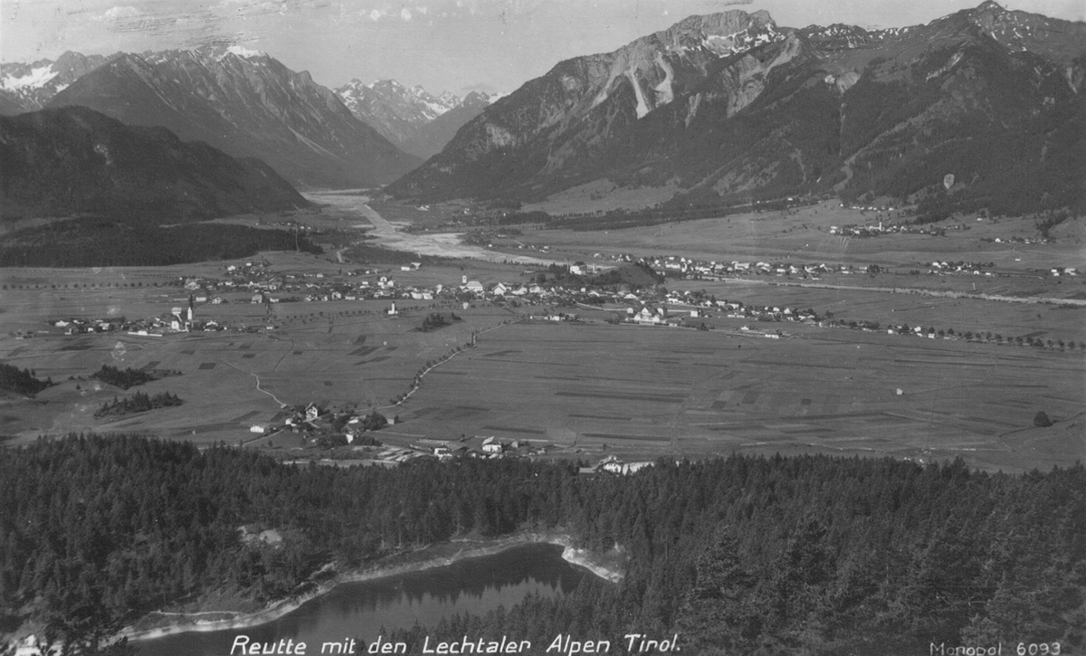 Reutte mit den Lechtaler Alpen - im Vordergrund der Urisee und Mühl - vmtl. um 1920er - Monopol Verlag - Foto zur Verfügung gestellt von Michael Hofer - Danke