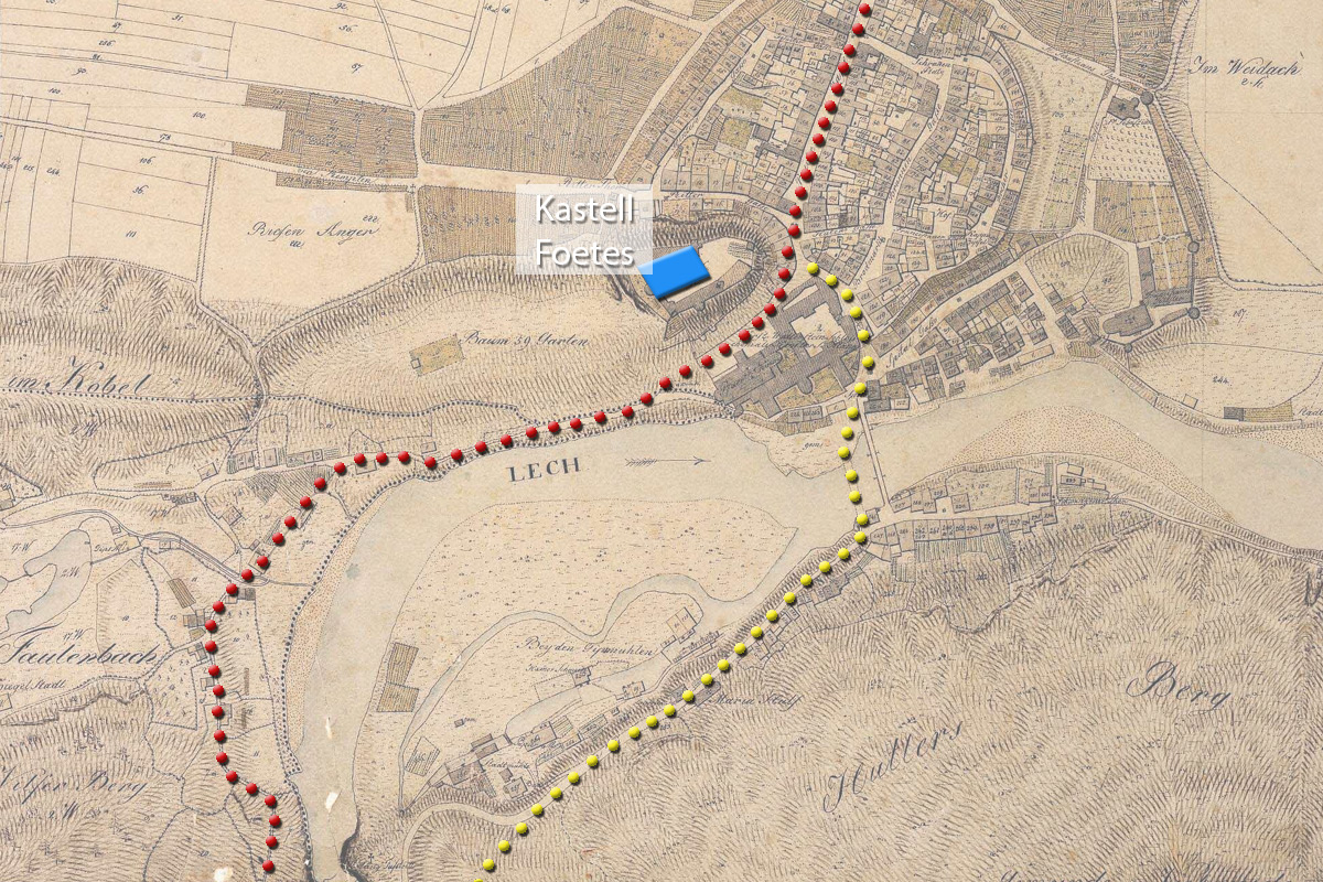 Damit wäre jedenfalls auch die Schwierigkeit des ziemlich steilen Waldstückes und dem Schrofenriegel am heutigen Ländeweg ausgeklammert worden. Oberhalb des Felsriegels am Lechfall weiter in Richtung nach Bad Faulenbach, wo es ja erwiesenermaßen eine römische Ansiedlung gegeben hatte. Analog zum Lauf des Lechs zu einem langgezogenen Rechtsbogen ausholend schließlich geradewegs gegen Ostnordost auf einem leicht ansteigenden Straßenstück an den gegen Süden abfallenden Sockel des damaligen Castell foetes hinan. Alle heutigen Durchgänge wie jenem an der Zufahrt von Füssen nach Bad Faulenbach oder der tief eingearbeitete Hohlweg westlich des Hohen Schlosses bestanden ja zu damaliger Zeit noch nicht. So konnte dieser Straßenabschnitt jederzeit gut gesichert werden. Von dort dann etwas oberhalb des heutigen Magnusplatzes vorüber, zum Ostsporn der Hochfläche des Hohen Schlosses und direkt in einer Linkskurve in den schnurgeraden Verlauf der Reichenstraße übergehend.