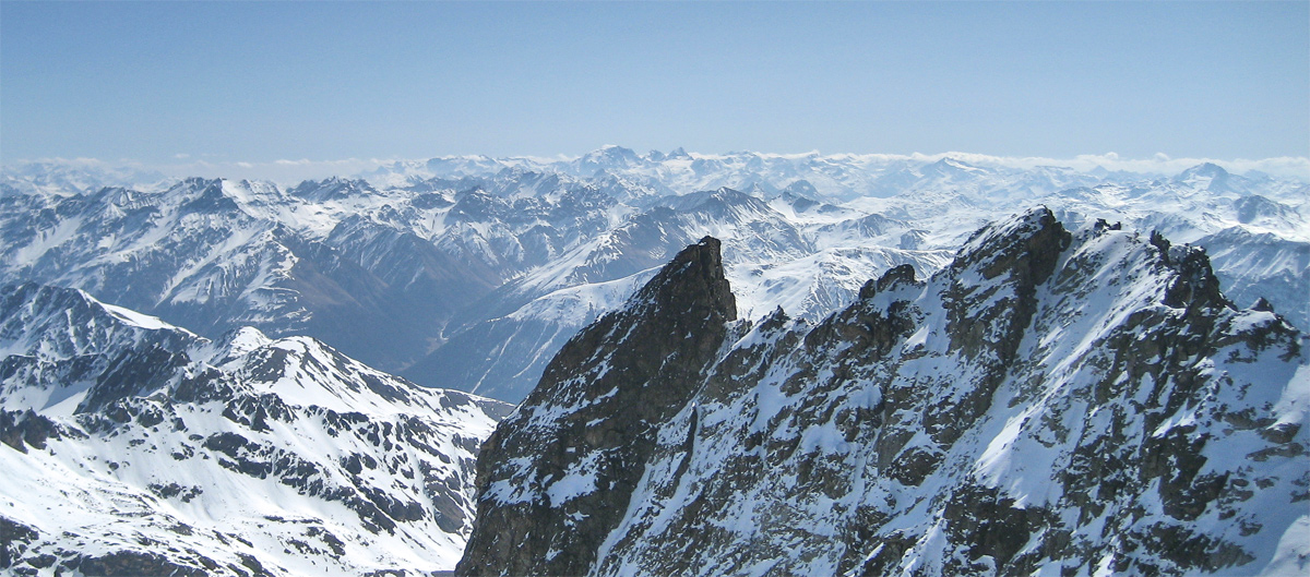 von oben gesehen (Piz Kesch, 3418m) wirkt die Keschnadel nicht mehr so bedrohlich wie von unten, im Hintergrund reicht der Blick bis hin zu der Ortlergruppe