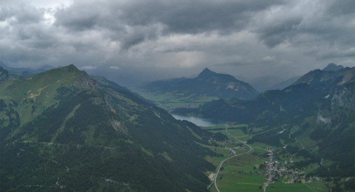 eine Regenfront zieht über das Tannheimer Tal hinweg; links im Vordergrund die Krinnenspitze, rechts im Hintergrund der Einstein bei Tannheim