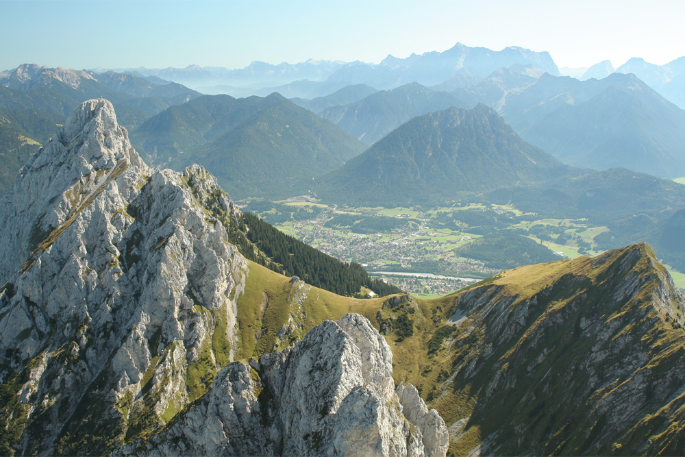 Gipfelblick von der Köllenspitze gegen Osten auf die Gehrenspitze, die Ammergauer Berge und dem davor liegenden Reuttener Talkessel; im Hintergrund das Zugspitzmassiv