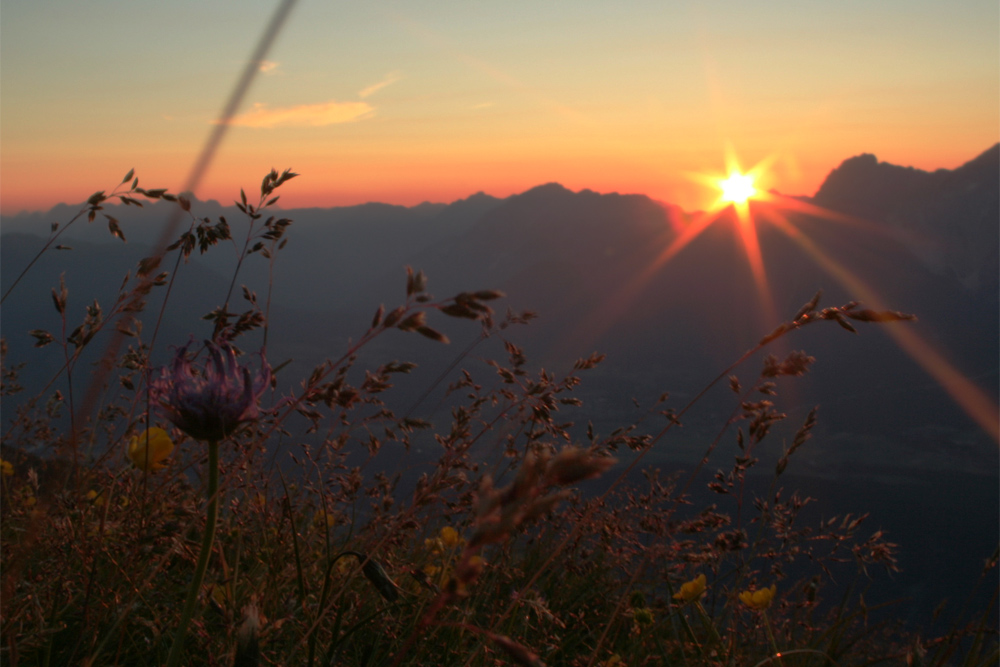 Sonnenuntergang auf dem Gipfel des Sonnkarköpfels in den Stubaier Alpen mit Blick über das Inntal hin zu den Lechtaler Alpen und den Mieminger Bergen