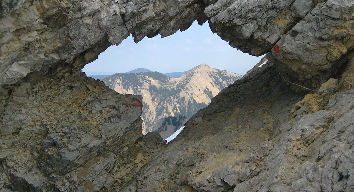 Blick durch das Fensterl an der Hochplatte auf Firstberg und Grubenkopf