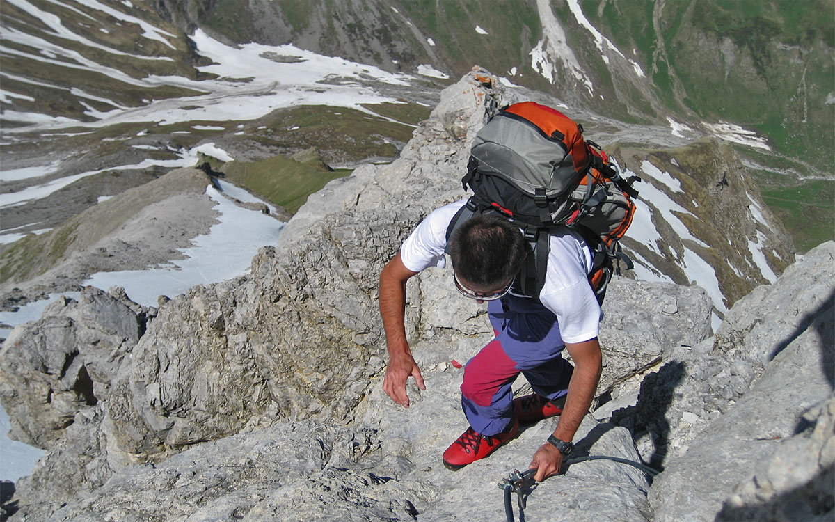 recht luftig geht es auf den letzten Metern vor Erreichen der Holzgauer Wetterspitze her - eine ansonsten griffarme Platte wurde mittels Stahlseil entschärft